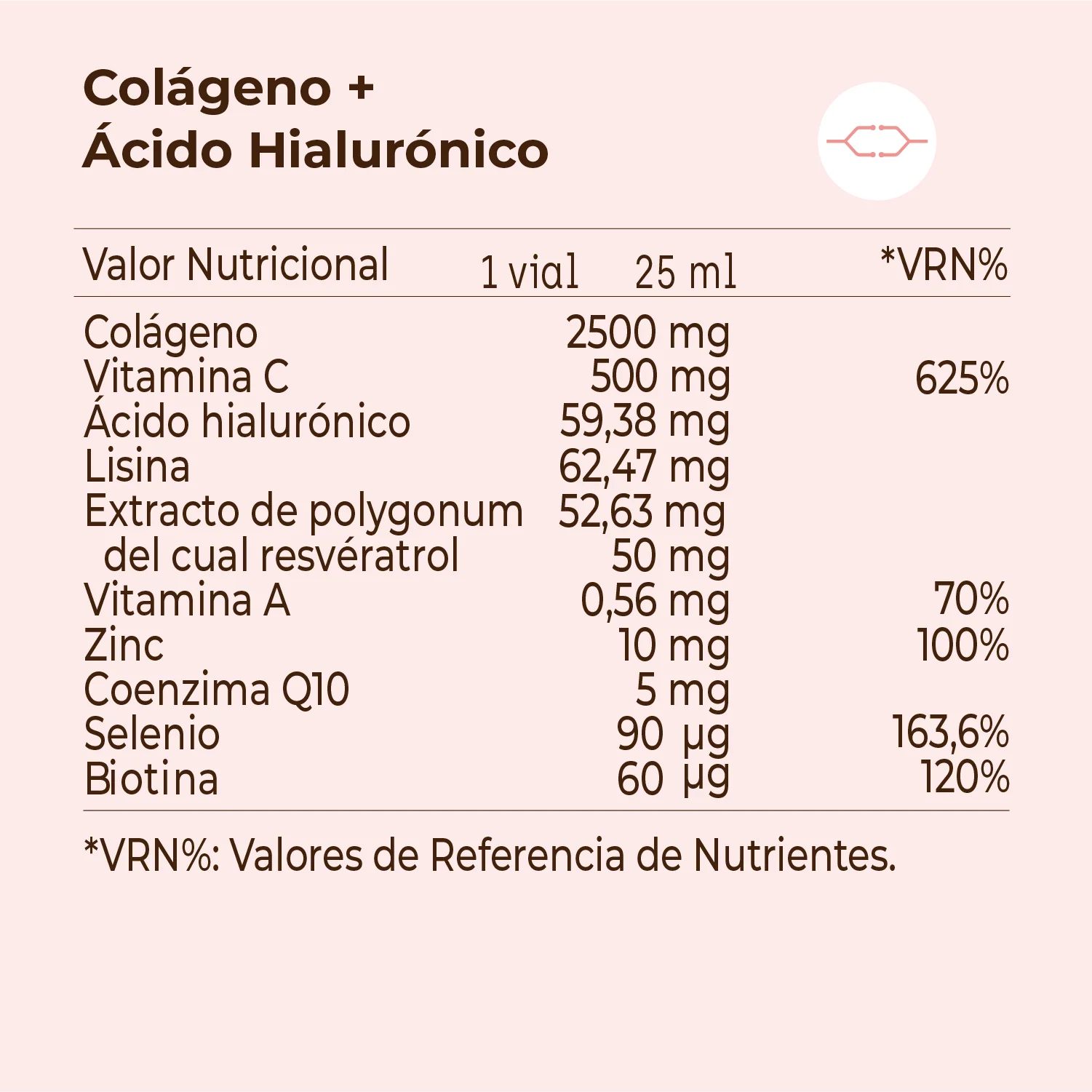 Ingredientes | Agua, colágeno, ácido L-ascórbico (vitamina C), corrector de acidez (ácido cítrico), hialuronato de sodio (ácido hialurónico), L-lisina HCL, extracto seco de poligonum (Polygonum cuspidatum, raíz), betacaroteno (vitamina A) [almidón modificado, jarabe de glucosa, betacaroteno (vitamina A), triglicéridos de cadena media, agua, antioxidante [alfa-tocoferol], agente de carga (fosfatos de calcio]], aroma de bayas, sulfato de zina, conservantes (sorbato potásico y benzoato sódico), agente de carga [goma xantana), edulcorante (sucralosa), coenzima Q10, selenito de sodio, D-Biotina (Biotina). |