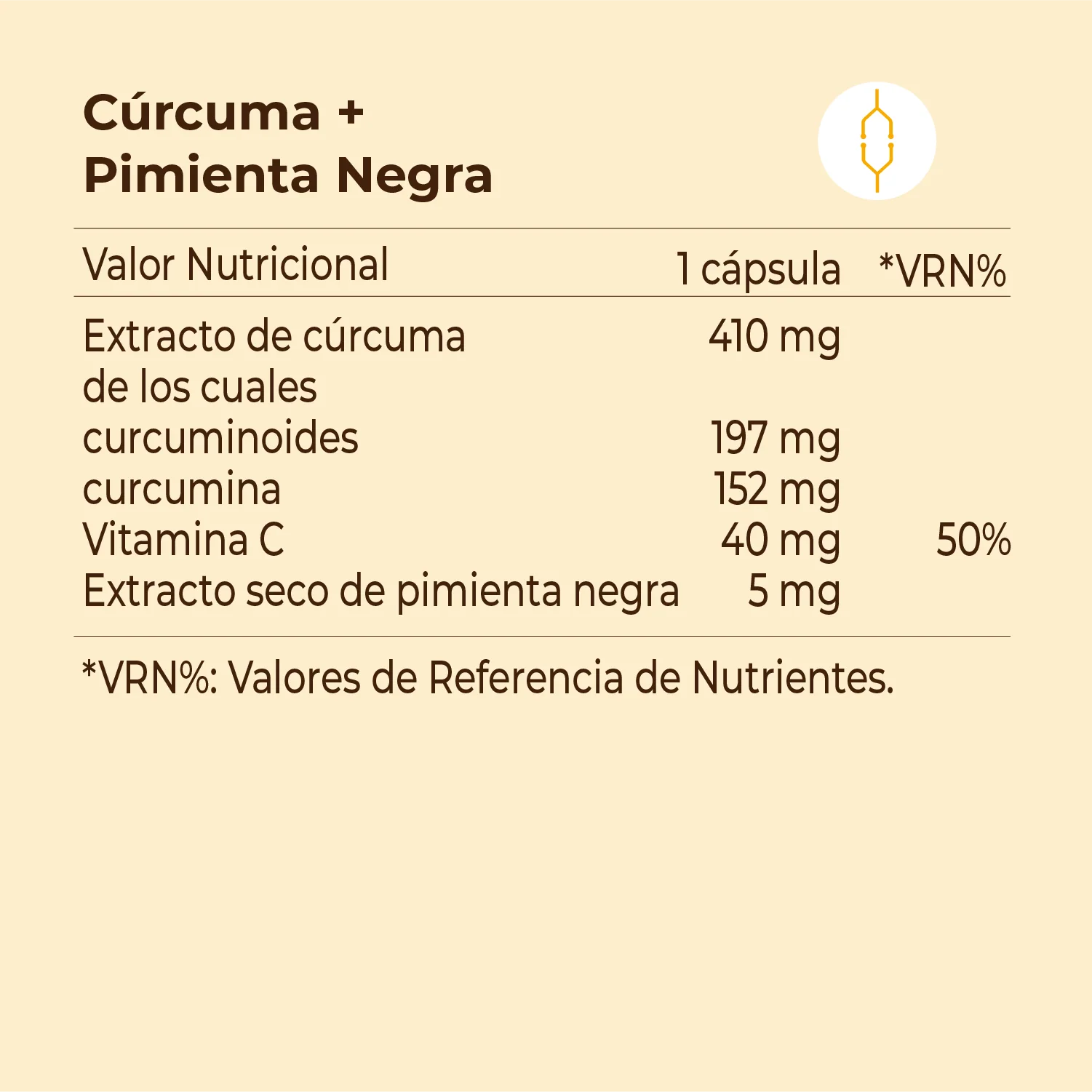 Ingredientes | Curcuma Meriva TM extracto seco 18% curcuminoides [(Curcuma longa L., raíz), emulsionante (lecitinas), agente de carga (celulosa microcristalina)], extracto seco de raíz de cúrcuma 95% curcumina (Curcuma longa L., raíz), agente de carga (celulosa microcristalina), agente de recubrimiento (hidroxipropilmetilcelulosa), Ácido L-ascórbico (vitamina C), antiaglomerantes (sales magnésicas de ácidos grasos, dióxido de silicio), extracto seco de pimienta negra (Piper nigrum, fruto). |