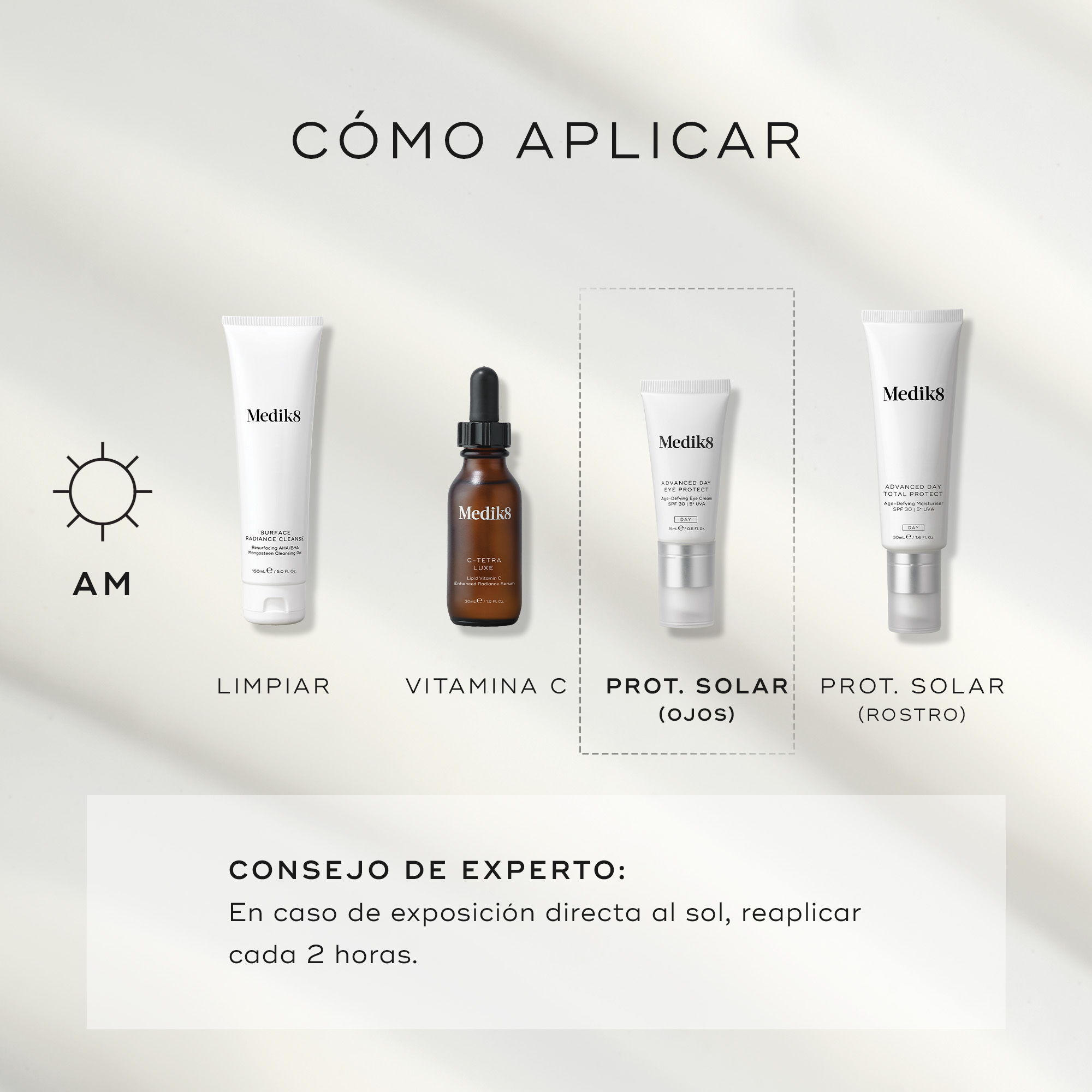 Por la mañana, después de la limpieza facial, aplica una cantidad adecuada de Advanced Day Eye Protect™ alrededor del área de los ojos, evitando los párpados. Masajea suavemente hasta su completa absorción. Se recomienda seguir con la aplicación de una crema hidratante con protección solar para el resto del rostro.