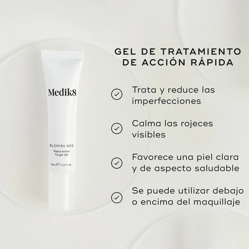 Blemish SOS de Medik8 es un tratamiento intensivo en gel que combate eficazmente las imperfecciones y brotes localizados. Su fórmula con ácido salicílico y ácido dioico actúa en profundidad para desobstruir los poros, reducir la inflamación y acelerar la desaparición de las imperfecciones sin resecar la piel. Gracias a su textura ligera y de rápida absorción, puede aplicarse bajo el maquillaje para un tratamiento discreto y continuo.