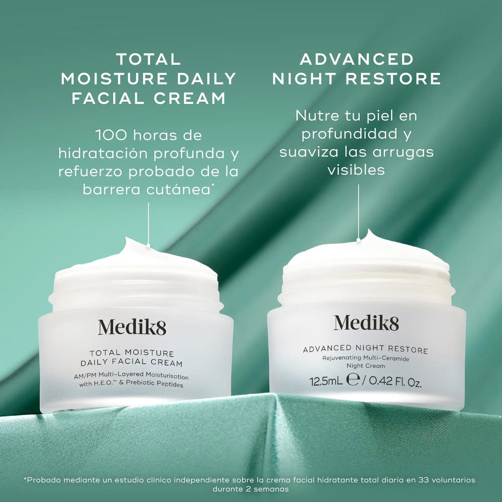 Sacia la sed de tu piel con esta combinación de hidratación intensiva. Durante el día, la crema facial hidratante Total Moisture Daily Facial Cream ha demostrado clínicamente que mejora la salud de la piel en solo 1 hora,[1] dejándola visiblemente suave, tersa y fortalecida frente a los factores estresantes diarios. Por la noche, Advanced Night Restore repone y nutre en profundidad para que te despiertes con una piel tersa, fresca y visiblemente descansada por la mañana.