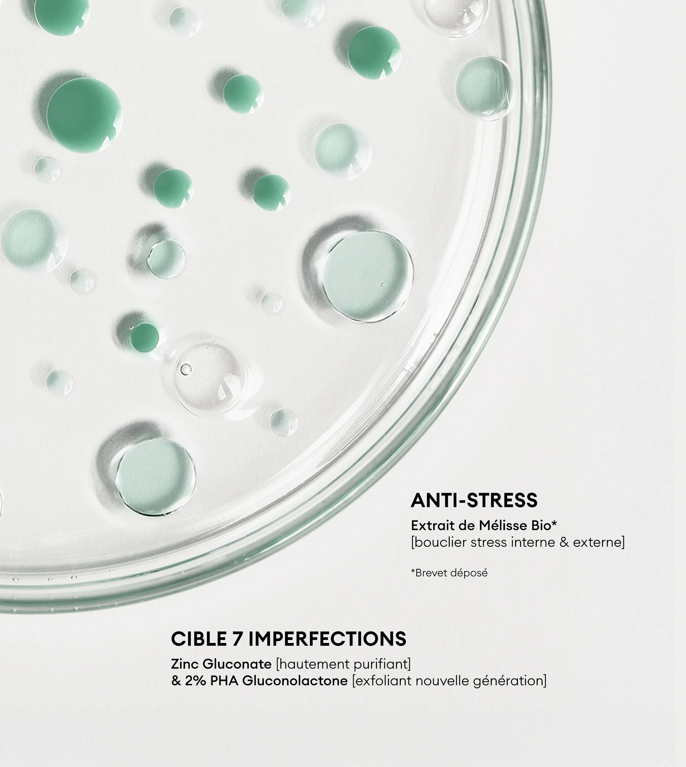 Enriquecido con el dúo estrella de activos [Gluconato de zinc + 2 % PHA/Gluconolactona] y extracto de Melisa orgánica, actúa sobre 7 tipos de imperfecciones en 7 días (brillos, poros dilatados, puntos negros, granos rojos, granos blancos, rojeces y marcas residuales), previene su reaparición y combate los efectos del estrés en la piel.