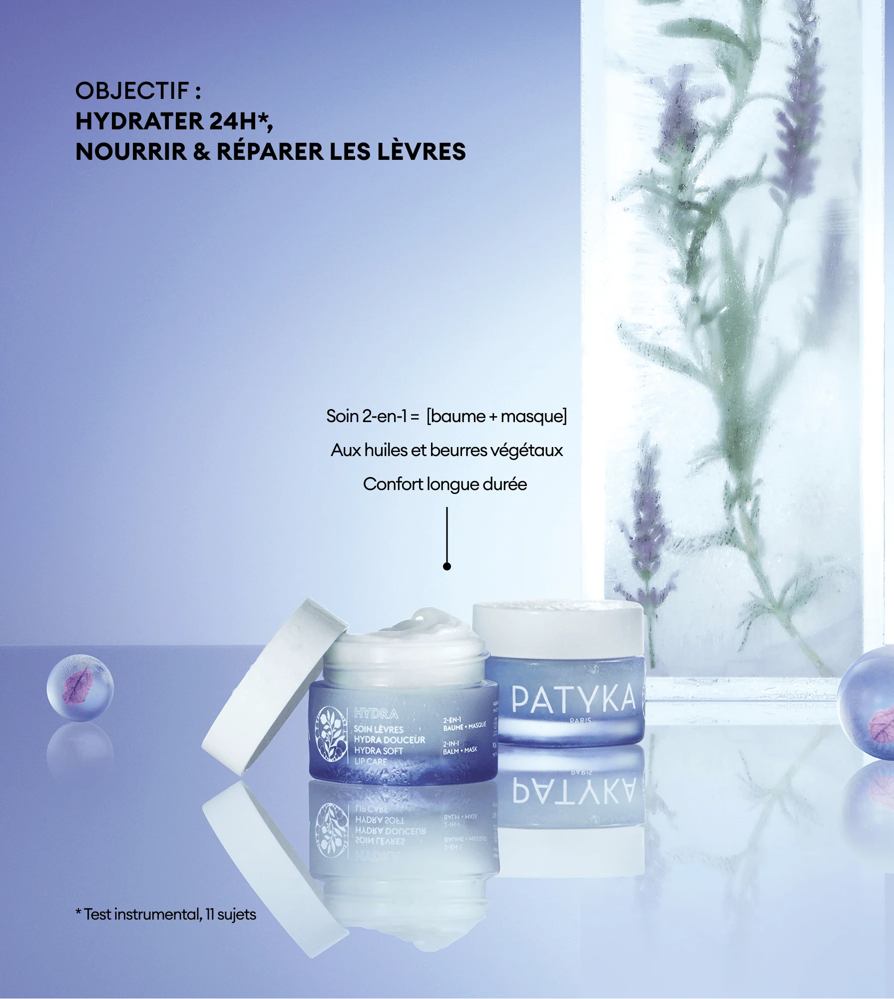Gracias al complejo HYDRA BALANCE [Ácido Hialurónico de Alto Peso Molecular + Células Activas de Lavanda Mariposa + Vitamina F], este tratamiento ofrece una hidratación intensiva y continua durante 24h*, a múltiples niveles. Para prevenir la deshidratación, un extracto de Melisa Bio (patente registrada por PATYKA**) combate los efectos del estrés y de la oxidación que debilitan la barrera cutánea.
