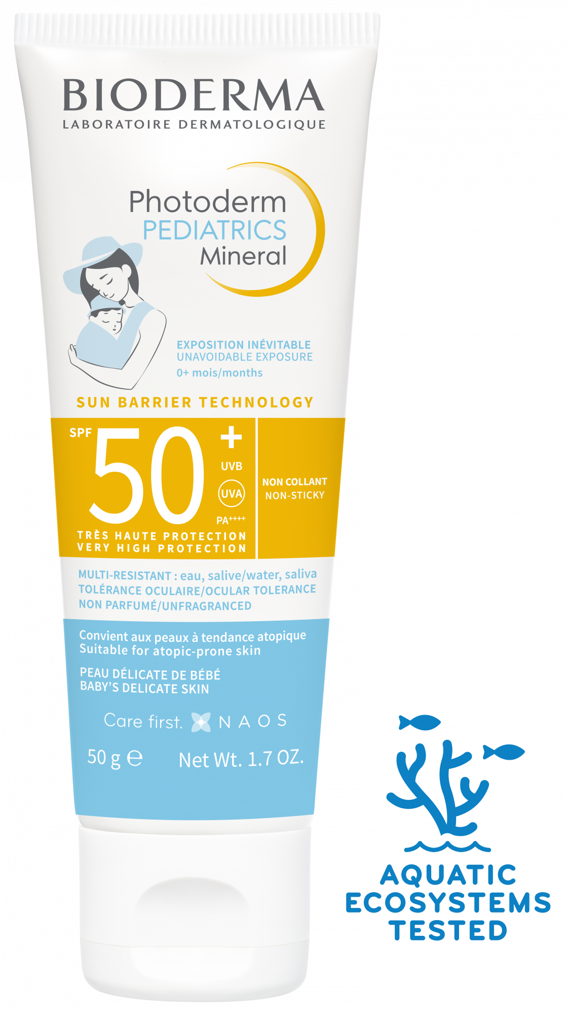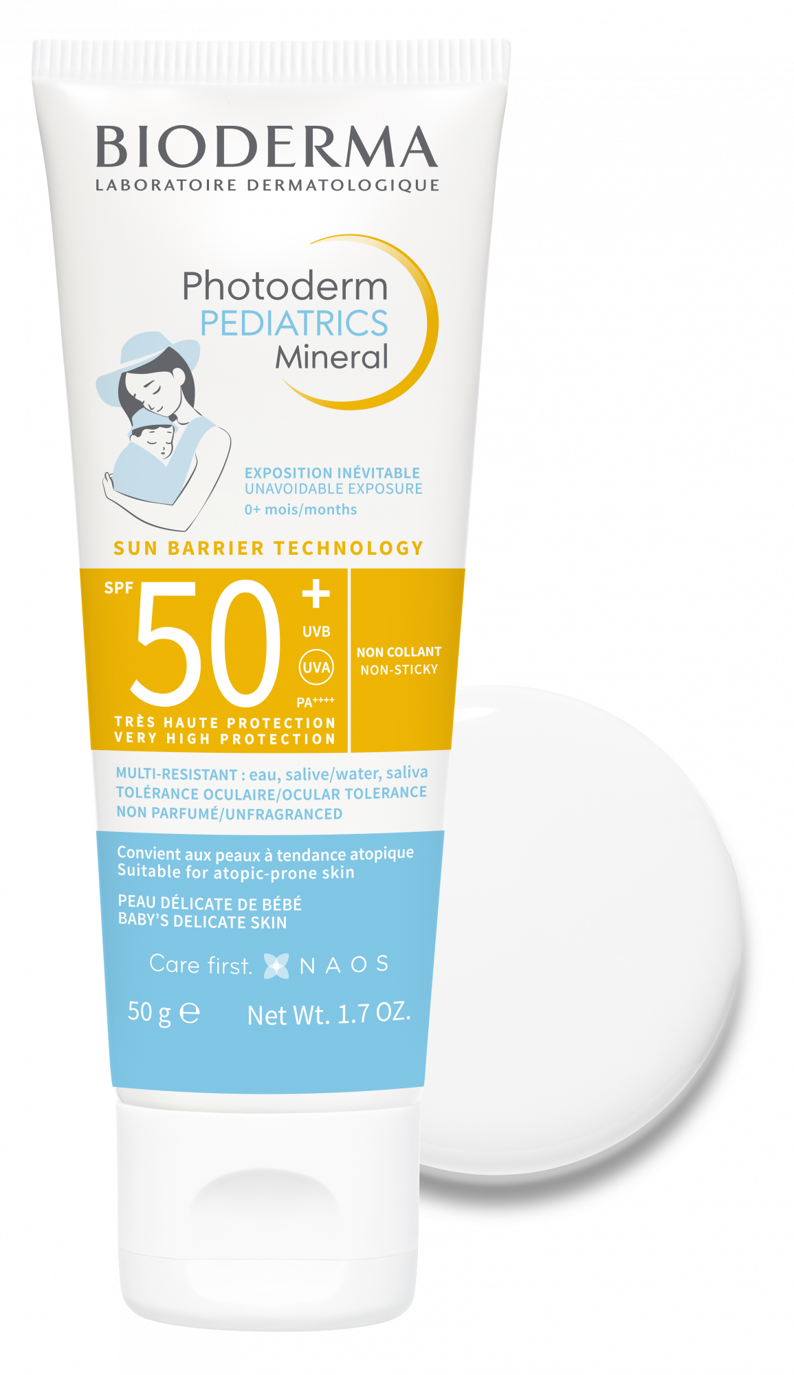 Pensado para bebés a partir de 0 meses (exposición indirecta) y niños con piel muy sensible, seca o con tendencia a la atopia. Su alta tolerancia cutánea y ocular, resistente al agua y sin perfume, lo hacen idóneo para proteger zonas descubiertas en situaciones accidentales de sol.