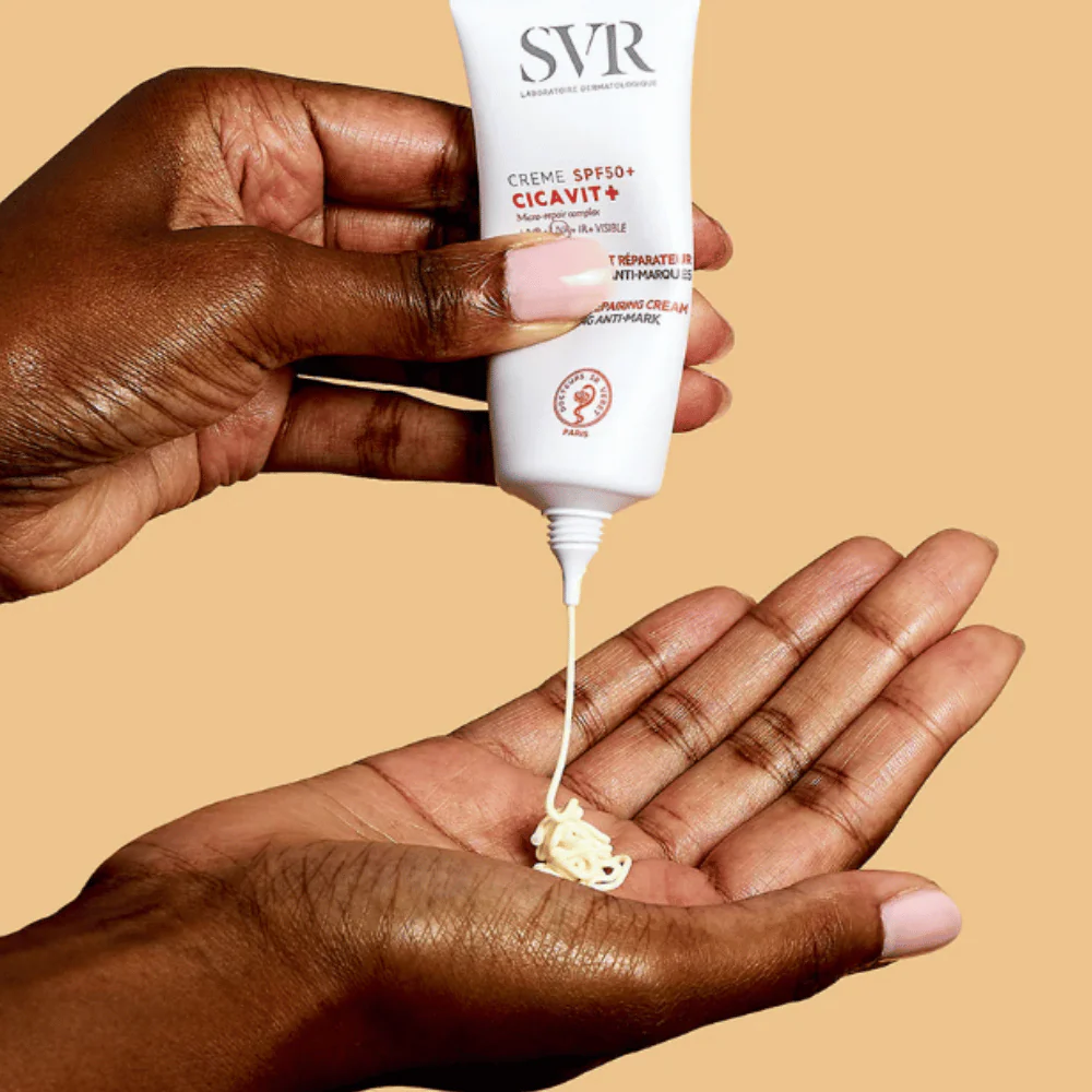 ¡CICAVIT+ Crème SPF50+ garantiza un verano sin manchas! Un tratamiento intensamente calmante que repara 7 veces más rápido. Protege de los rayos, reduce el riesgo de marcas rojas y oscuras. Su textura invisible se integra en la piel para calmarla intensamente y acelerar su reparación. Resistente al agua.
