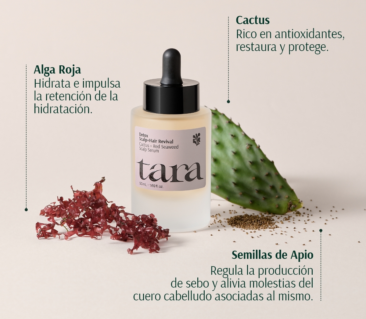 Ideal para cueros cabelludos sensibles, irritados o con tendencia a la sequedad, Tara Detox Sérum de Cactus + Alga Roja es el aliado perfecto para revitalizar tu melena desde el origen.